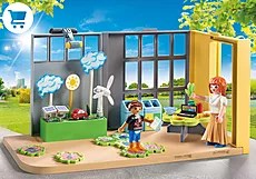 Bienvenue dans la classe de demain ! Ici, les enfants n’apprennent pas seulement des connaissances importantes du quotidien, les sujets autour du climat et de la protection de l’environnement sont aussi au programme. Comment lit-on un diagramme climatique, comment trier correctement ses déchets ? Il ne s’agit pas seulement de théorie puisque des bacs de tri sont fournis. Un puzzle sur la protection du climat encourage les enfants, de façon amusante, à adopter un comportement responsable de l’environnement. Le coffret contient deux personnages PLAYMOBIL, une maquette climatique, une table, quatre poubelles, un puzzle sur la protection du climat et beaucoup d’autres accessoires. Ce coffret peut être utilisé individuellement ou combiné avec l’école (réf 71327).