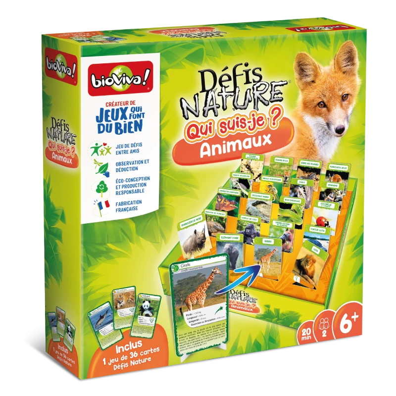 2 jeux en 1 : le jeu Défis Nature Qui suis-je ? Animaux contient un jeu de 36 cartes Défis Nature inédit. Vous pouvez l’utiliser pour jouer aux règles classiques de Défis Nature.