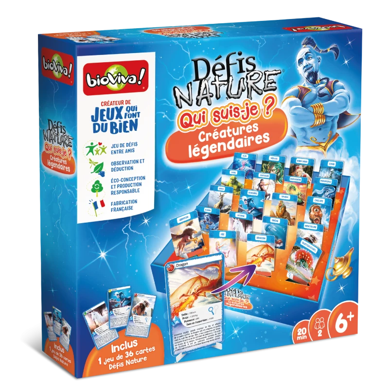 2 jeux en 1 : le jeu Défis Nature Qui suis-je ? Créatures légendaires contient un jeu de 36 cartes Défis Nature. Vous pouvez l’utiliser pour jouer aux règles classiques de Défis Nature.