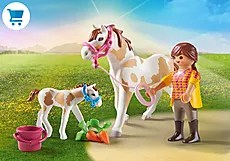La jument coule des jours heureux avec son poulain. La monitrice d’équitation, leur apporte tous les soins nécessaires. Cette jument et son petit savourent des fruits et légumes frais et la vie est belle dans cette vaste prairie où chaque animal trouve sa place.