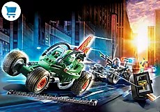 Un bandit vient de dérober un coffre-fort blindé de la banque. Il le tracte derrière sa voiture à l’aide d’une corde, mais le policier sur son kart compte bien le rattraper. Ces véhicules sont équipés d’un moteur à rétrofriction. Contient deux personnages.