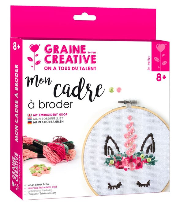Kit complet pour broder un motif tendance de licorne comprenant un canevas imprimé, un tambour en bois, une aiguille, 8 échevettes de 4 m et sequins