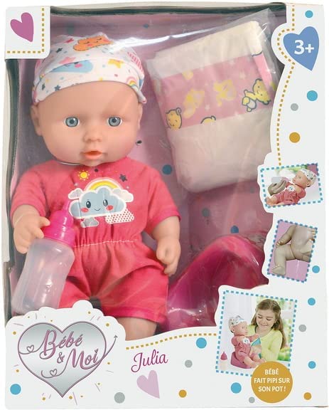 Poupon Julia 27 cm : après lui avoir donné le biberon, assois Julia sur le pot pour faire pipi. N’oublie pas de lui mettre sa couche pour la sieste. Ses yeux se ferment pour dormir. Biberon, couche, pot inclus. Bébé de 27 cm. Dès 3 ans.