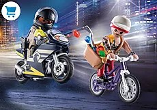 Courses poursuite et adrénaline sont au menu de cette rencontre entre bandit et policier. Qui des deux l’emportera ? Le voleur finira-t-il sa course derrière les barreaux de la prison du commissariat de police ? Ou bien le policier finira-t-il par être distancé, éreinté de sa course ? Tous les scénarios sont possibles dans cette scène de jeux. Les deux protagonistes ayant enfourché leur moto à toute allure, ils risquent bien de se livrer bataille sur la route encore longtemps. Ce set de jeux dispose de deux motos avec deux personnages et des accessoires pour renforcer le réalisme de l’expérience immersive.